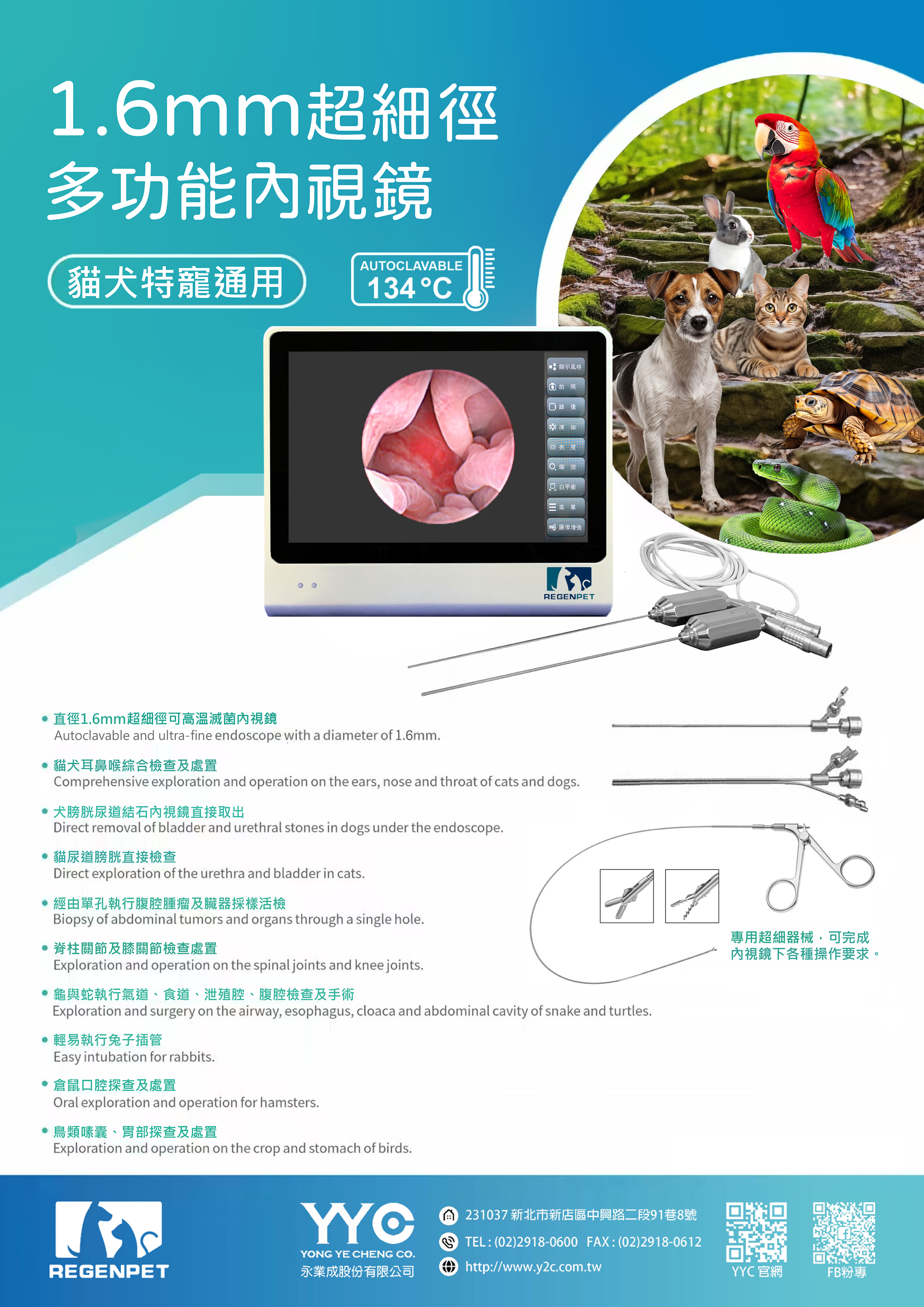 銘謝夏洛克動物醫院李聞笙院長及院內各位獸醫師的支持與惠顧,採購永業成股份有限公司自有品牌力晶沛REGENPET 1.6mm超細徑電子內視鏡,該內視鏡為目前市場上最細徑的硬式電子內視鏡,由於此特點所以更能適用於小型犬貓的臨床檢查及處置程序,例如: