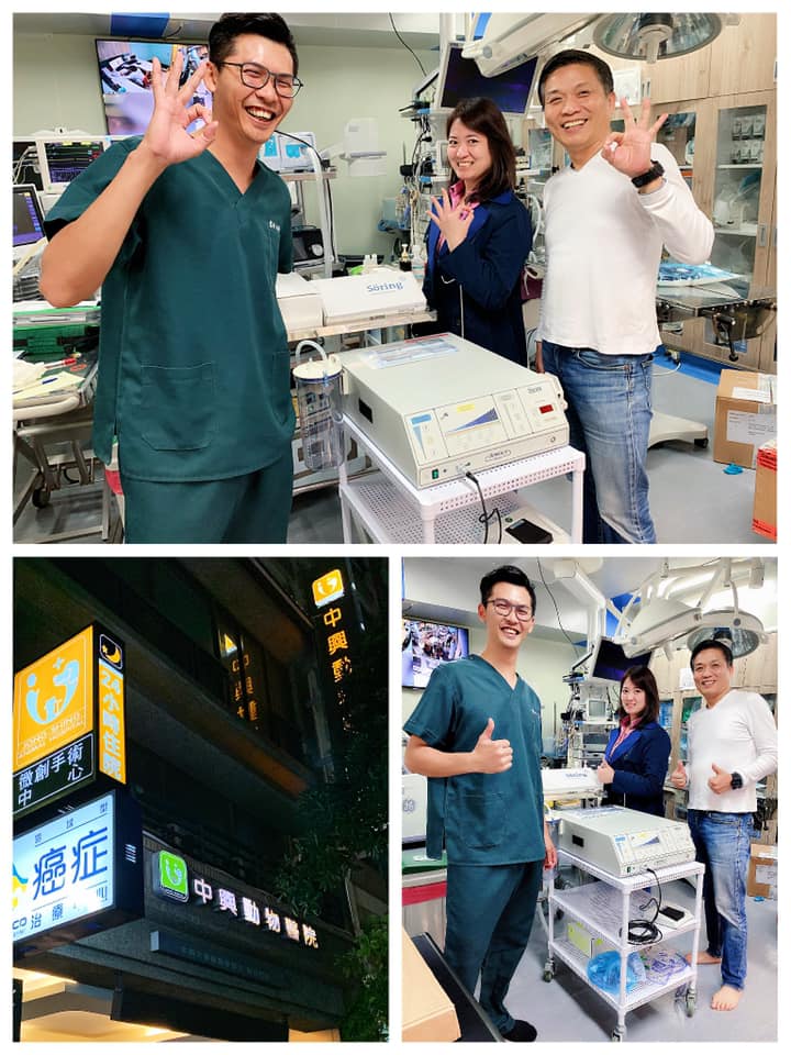 銘謝高雄中興動物醫院張益福院長及孫榮賢主任在嚴謹的試用比較後,採購本公司代理德國Söring SONOCA 300 四合一超音波手術平台,搭配超音波手術吸引手機及超音波椎骨刀手機,日後無論是臟器及軟組織腫瘤摘除及IVDD椎間盤減壓治療都能安全無虞一體適用,發揮最大臨床效益;大高雄地區的毛小孩有福了!