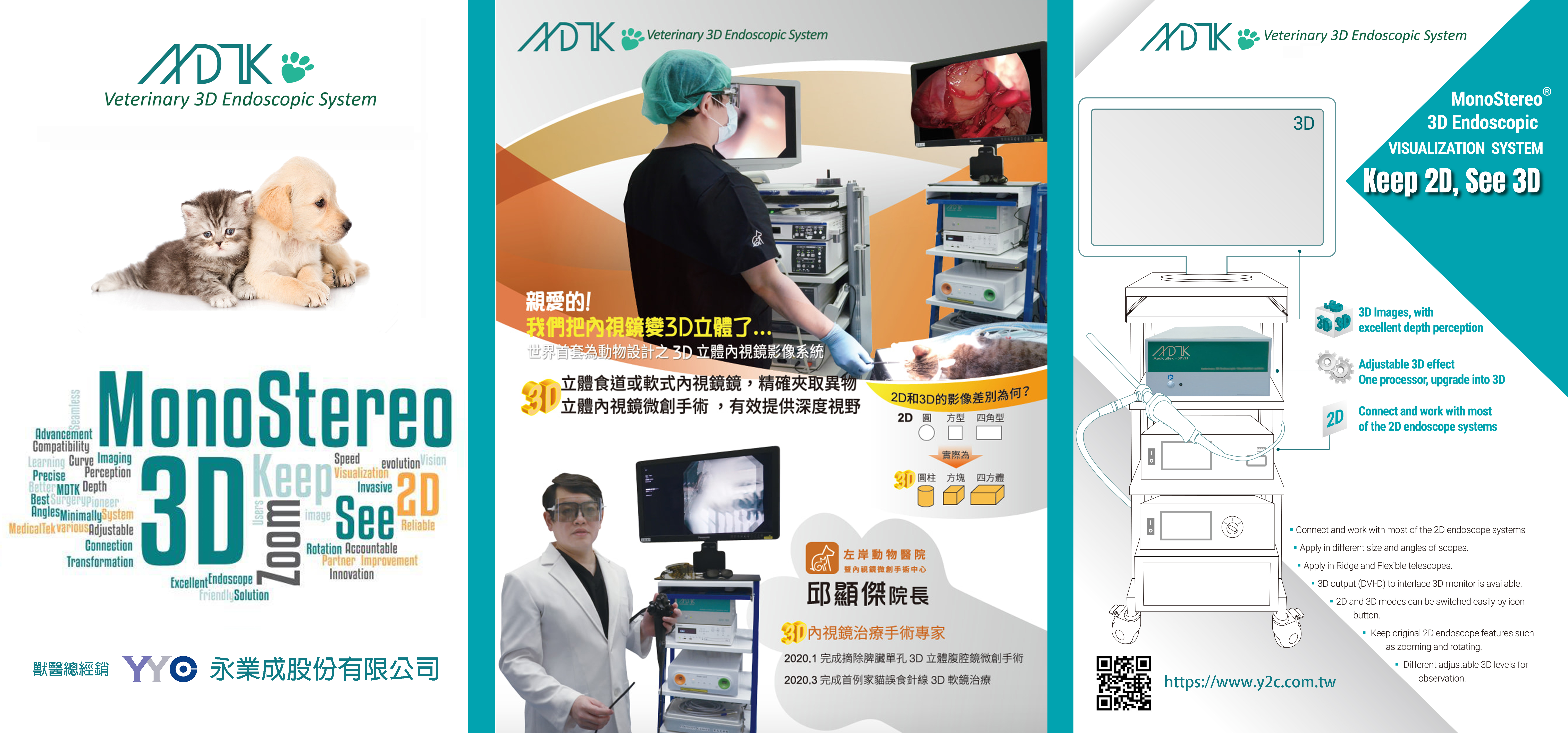 首先要向各家動物醫院及各位獸醫師推介的產品是MonoStereo 2D內視鏡影像轉換3D影像系統,該系統可相容於市面上各種2D內視鏡系統,降低醫療院所升級3D系統的硬體成本。MonoStereo產品系統中包含立體視覺參數調整,可設定眼鏡觀看立體影像的視差距離,讓醫師以最舒適狀態進行手術。法國IRCAD Jacques MARESCAUX教授研究團隊發現在特定微創手術動作上,MonoStereo顯著可協助醫師節省20%~30%時間。另外左岸動物醫院暨內視鏡微創手術中心邱顯傑院長更以首位獸醫使用者分享3D內視鏡影像對於臨床手術的幫助及其重要性,同時也認為3D內視鏡影像運用於動物醫療將如同人類醫療一般也會逐漸成為一種趨勢。詳細內容請參閱以下連結: https://www.youtube.com/watch?v=4CvIow8oKXw