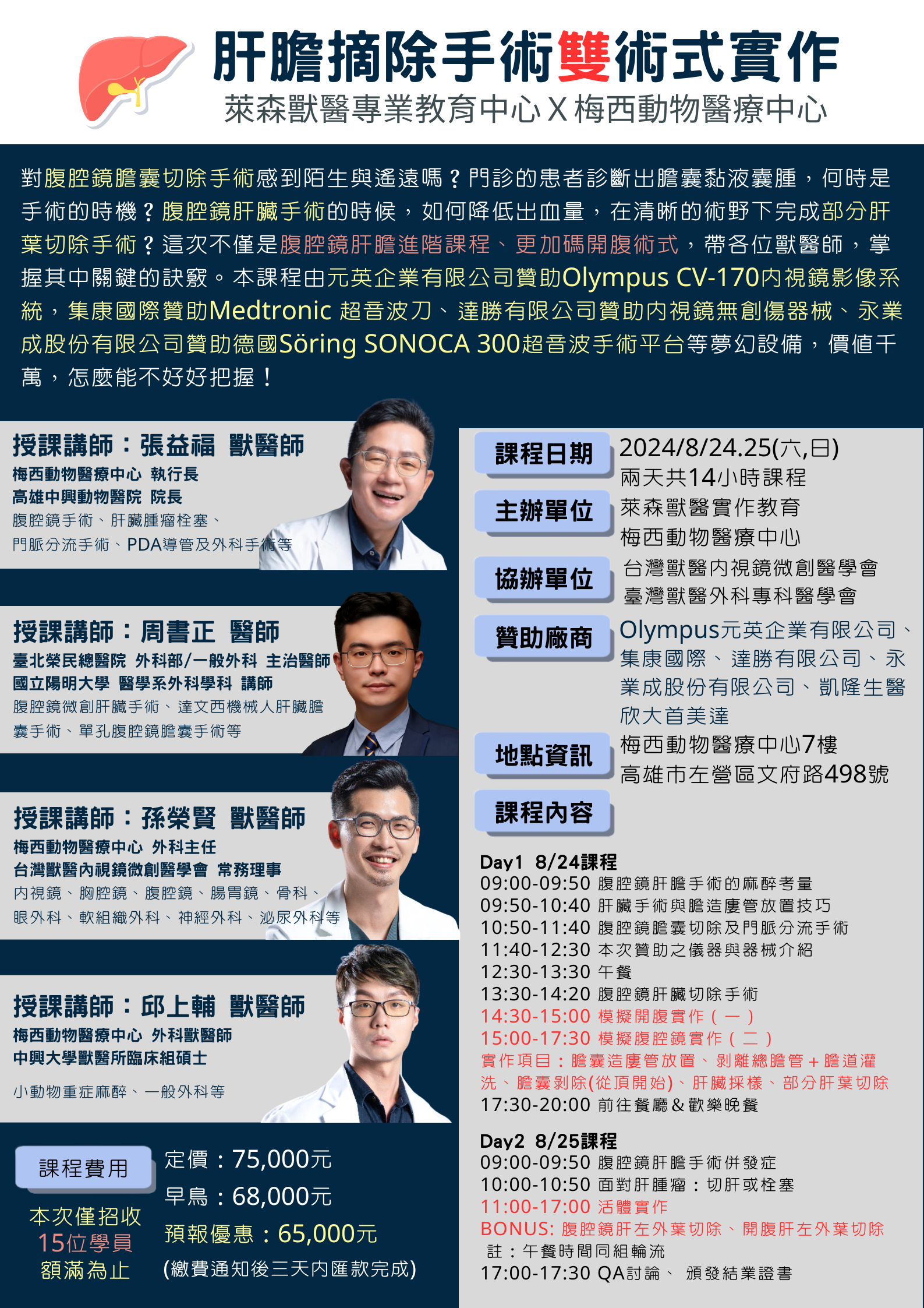 本公司將於2024年8月24-25日(星期六、日)參加由萊森獸醫專業教育中心暨梅西動物醫療中心所主辦之肝膽摘除手術雙術式實作課程,本次課程特別邀請梅西動物醫療中心張益福執行長、臺北榮民總醫院周書正醫師、梅西動物醫療中心孫榮賢主任及邱上輔獸醫師擔任講師,傳授全新的升級的課程內容從獸醫麻醉、犬肝膽病生理、血管栓塞介入,全方位角度思考,結合人醫成熟的肝膽手術精準度,提供最符合獸醫臨床的肝膽手術。