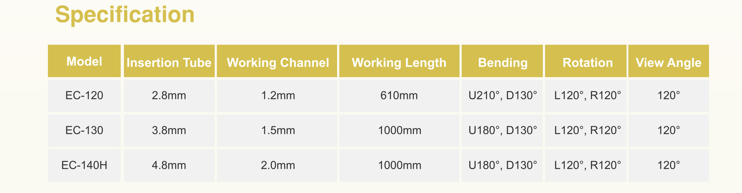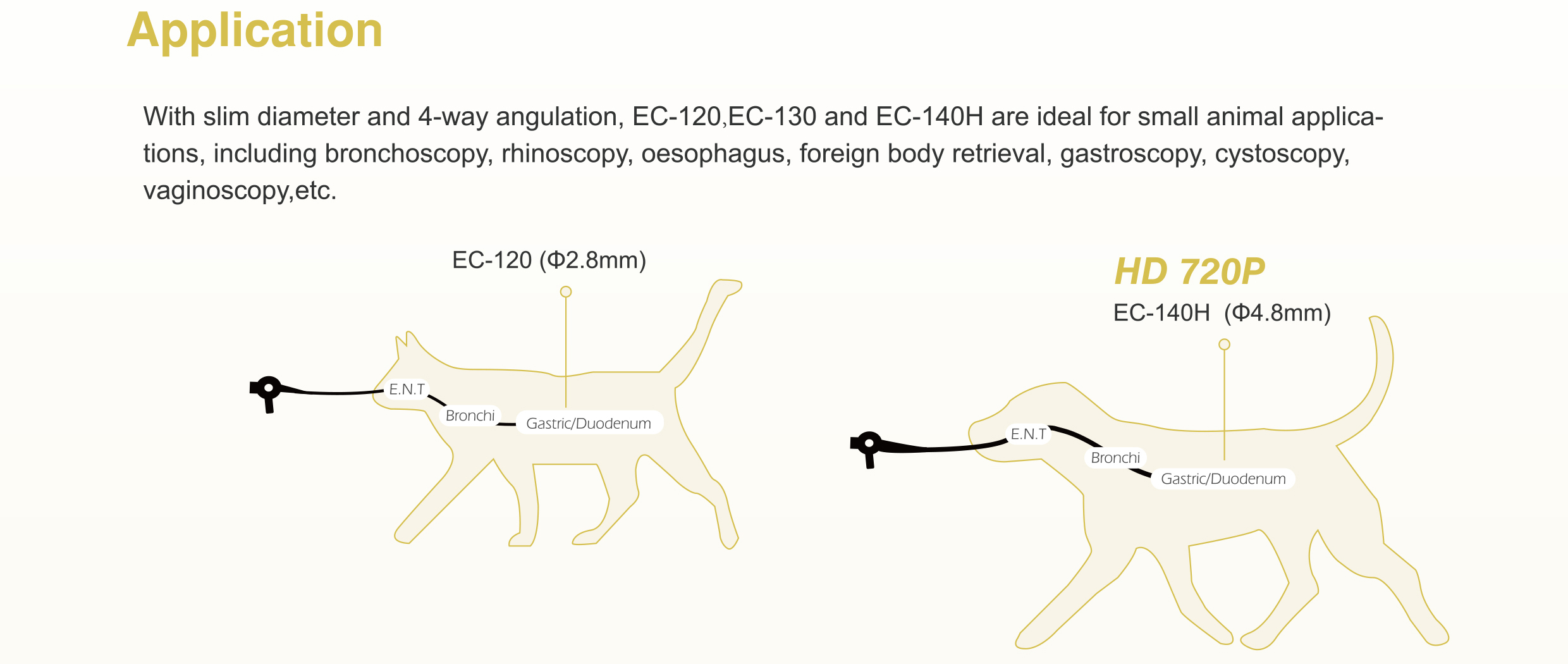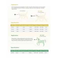 EC-120、EC-130和EC-140H外鏡纖細,可四向彎曲,適用於小動物 喉、 氣管、食道、胃腸及尿道等部位檢查,搭配對應器械可進行活檢採樣及取出異物等操作。
