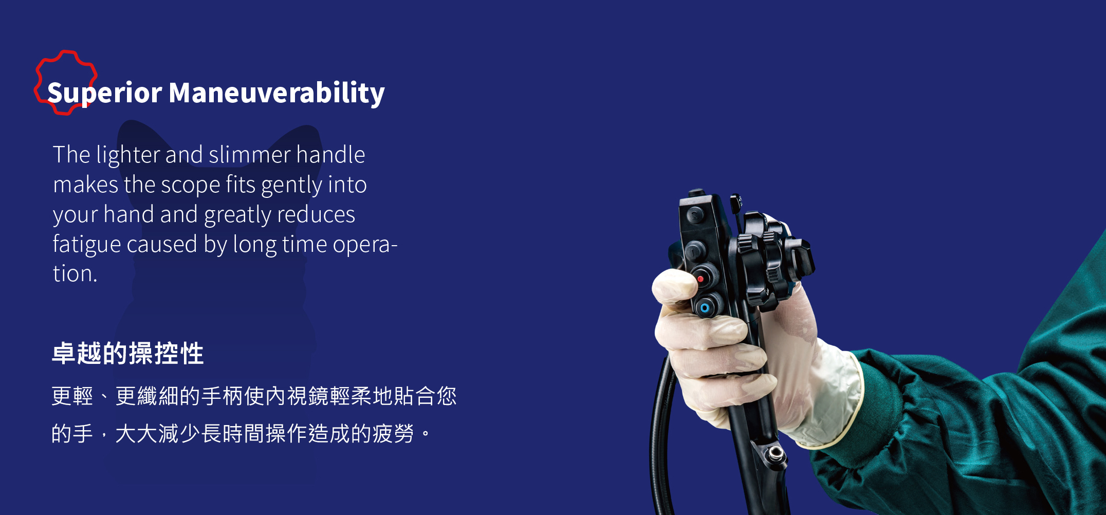 更輕的重量和更纖細的控製手柄使內視鏡輕柔地貼合您的手,大大減輕了長時間操作帶來的疲勞。