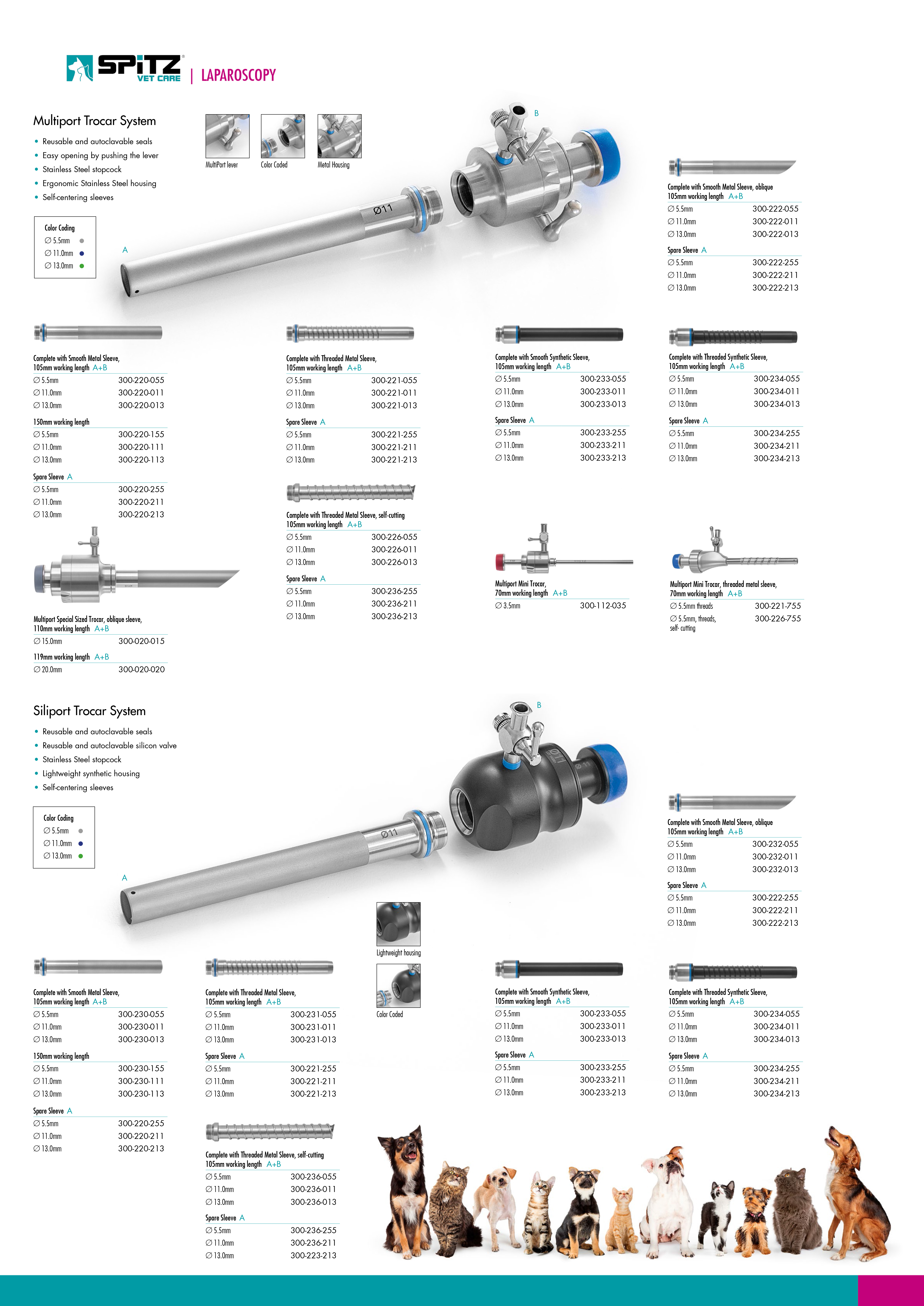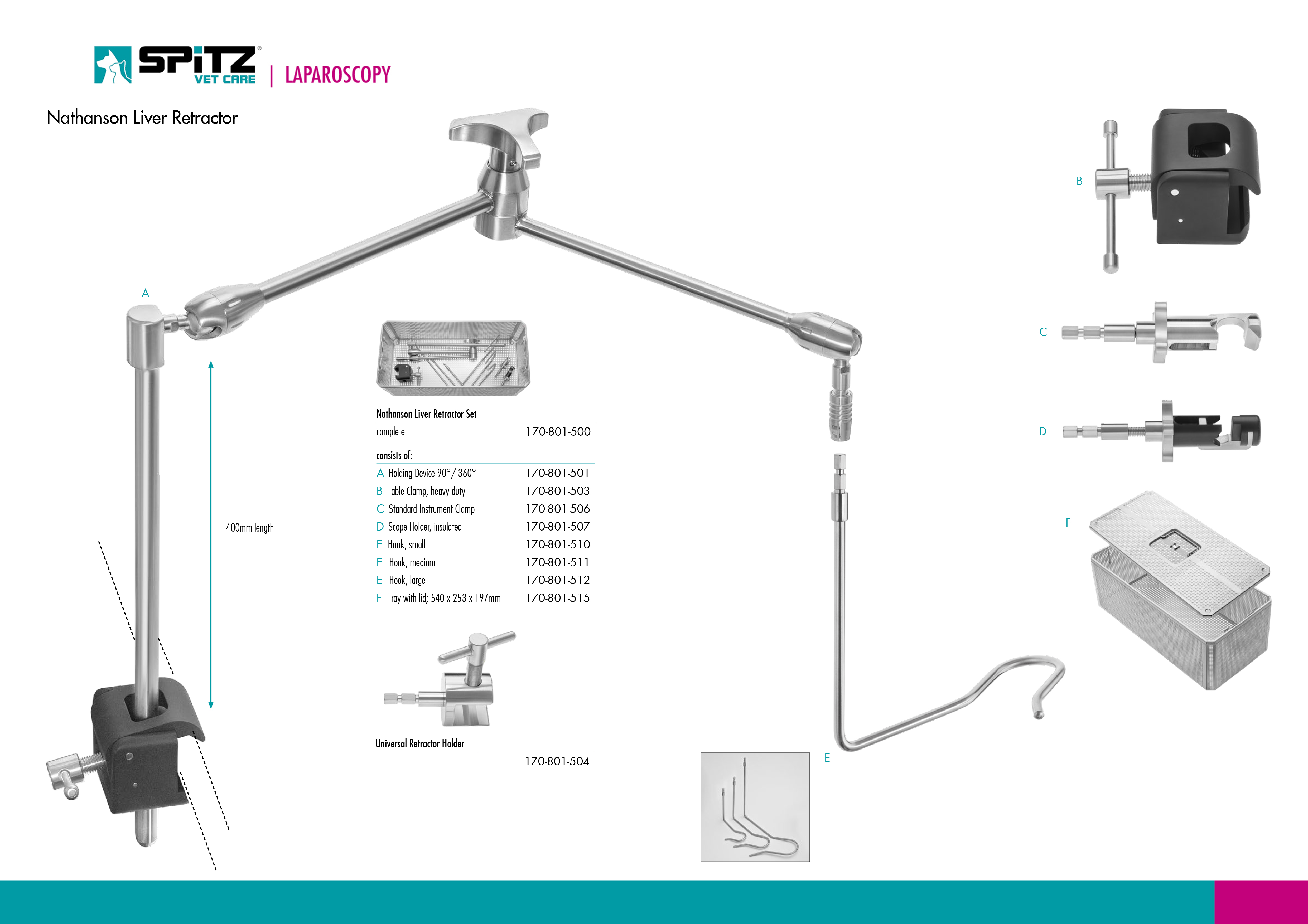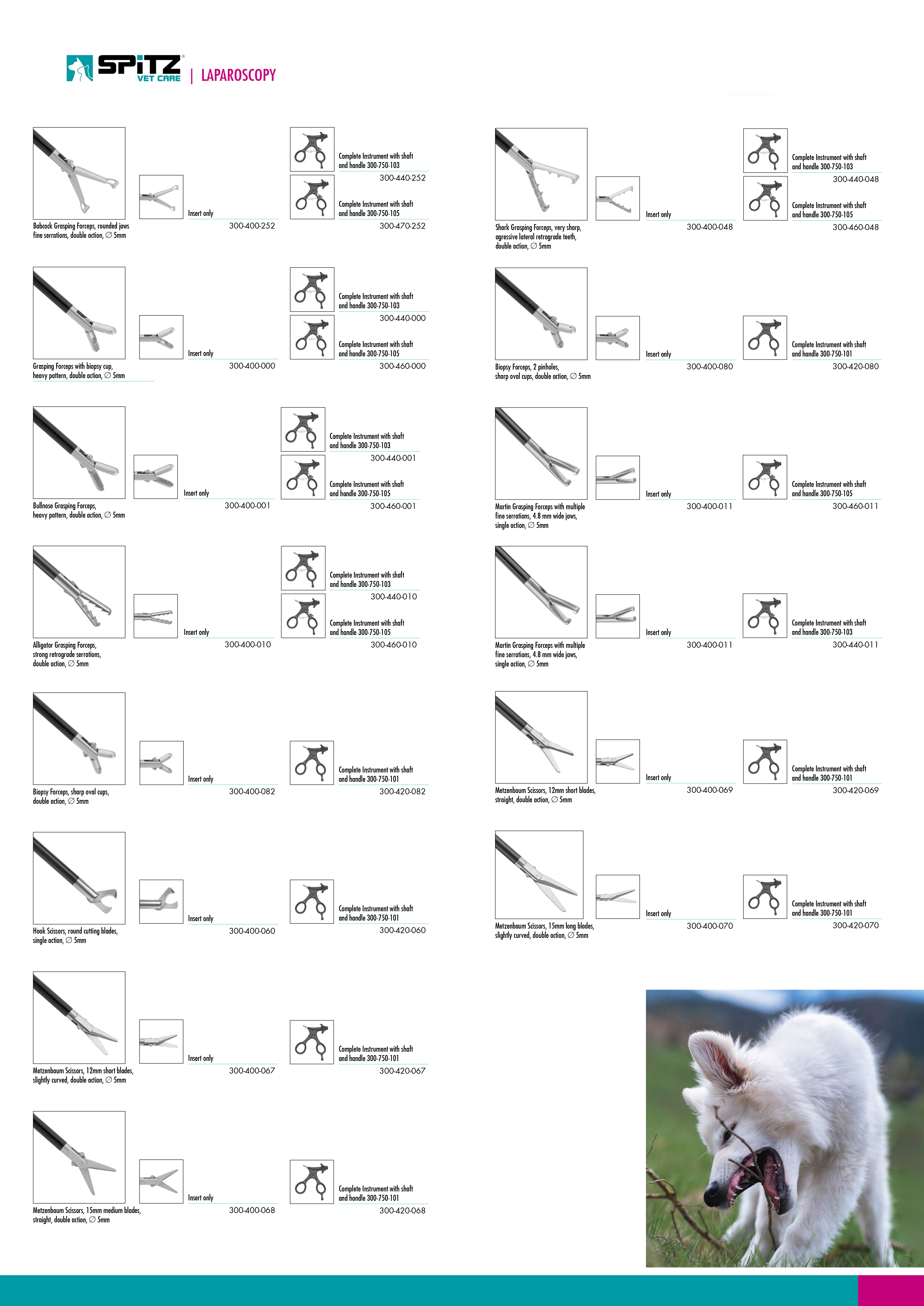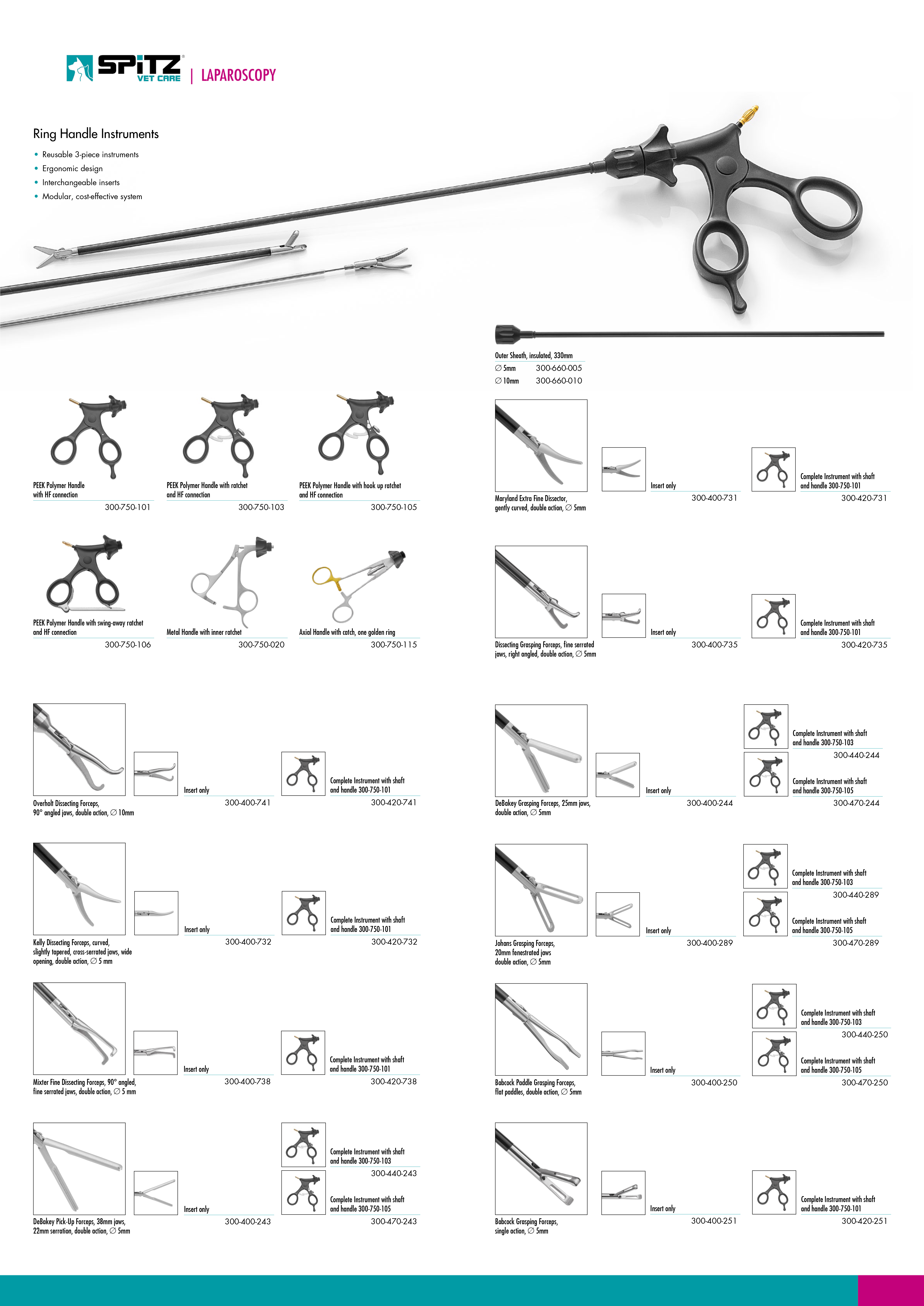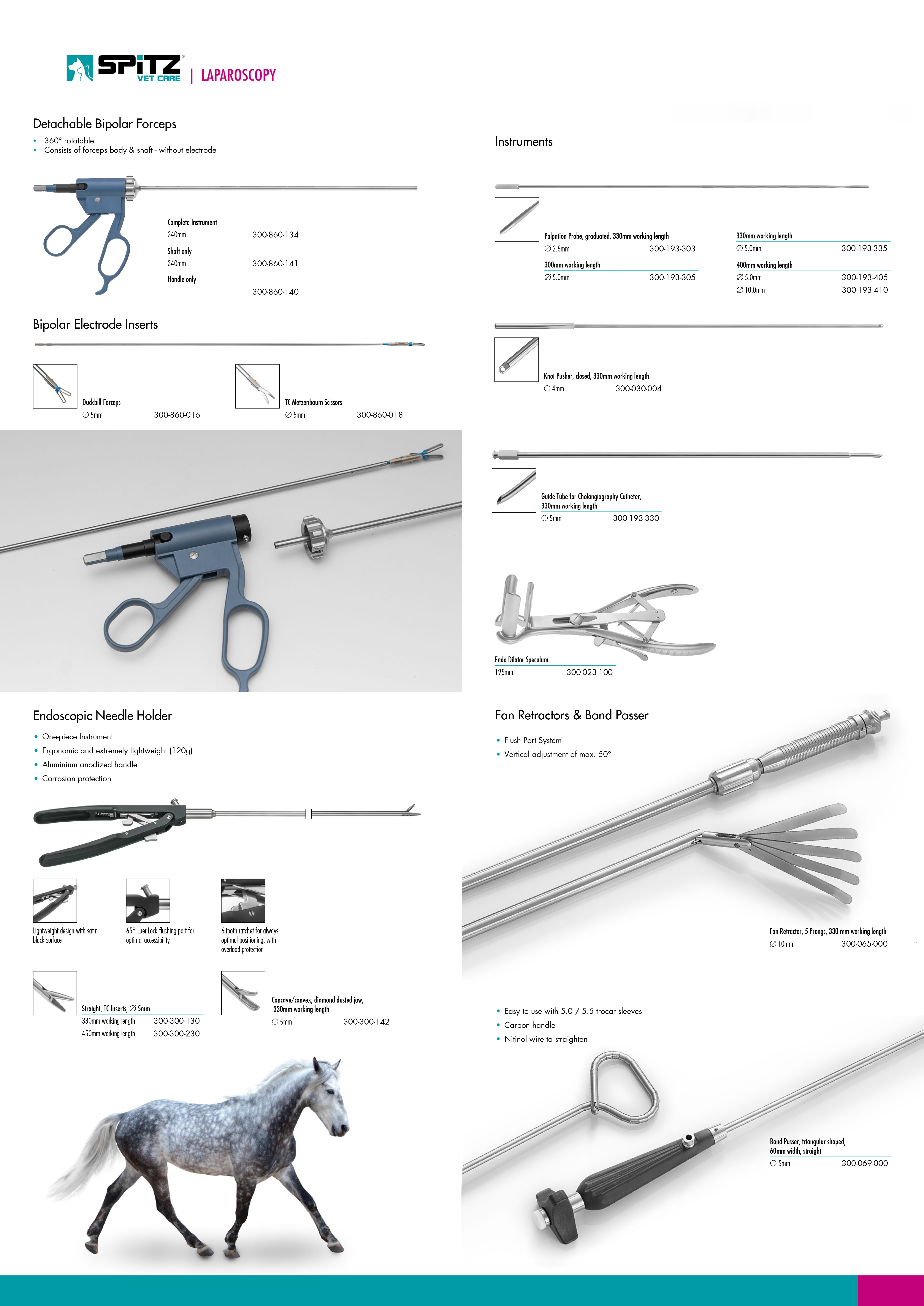 可拆卸雙極電燒鉗(Detachable Bipolar Forceps)、雙極電極內芯(Bipolar Electrode Inserts)、觸診探棒(Palpation Probe)、推結器(Knot Pusher)、膽管造影導管引導套管(Guide Tube for Cholangiography Catheter)、內視鏡擴張器(Endo Dilator Speculum)、內視鏡持針器(Endoscopic Needle Holder)、扇型提撐器及蛇形管提撐器(Fan Retractors & Band Passer)
