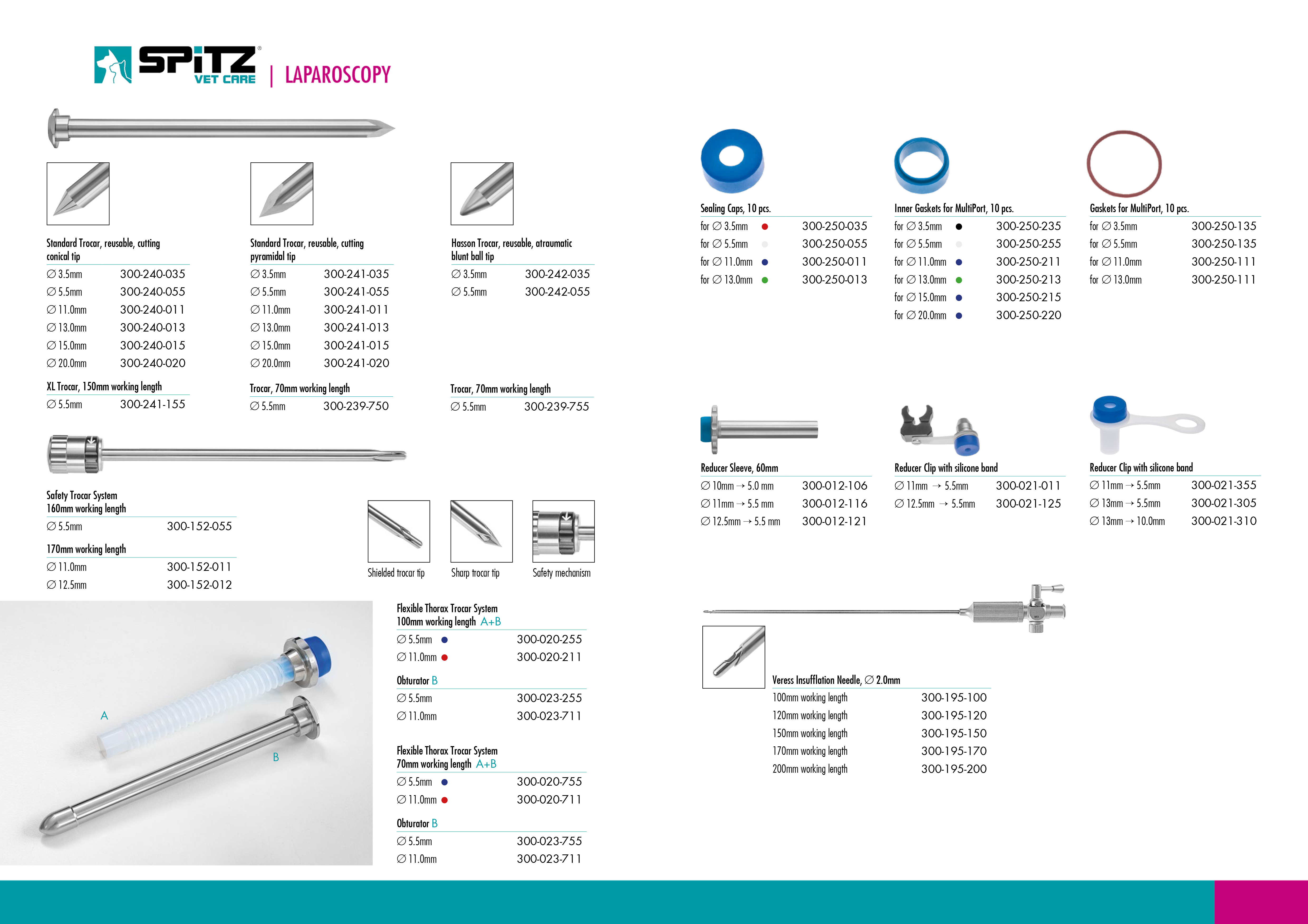 安全穿刺套管系統(Safety Trocar System)、胸腔鏡穿刺套管系統(Thorax Trocar System)、減徑器(Reducer)及充氣針(Veress Insufflation Needle)