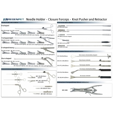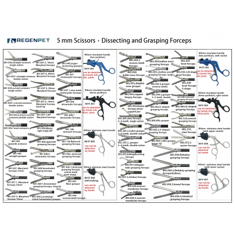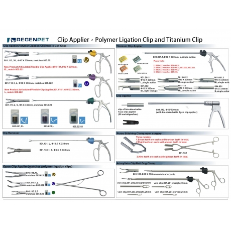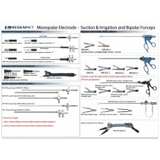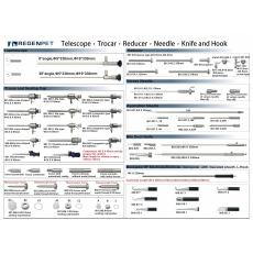 各式腹腔鏡、穿刺器、減徑器、氣腹針、穿刺針、切開刀及單極電凝 各式5mm腹腔鏡手術器械、剪刀、剝離鉗及抓取鉗 各式10mm腹腔鏡手術器械、剪刀、剝離鉗及抓取鉗 各式單/雙極電凝及沖吸管 各式持針器、腹壁縫合器、推節器及撐開器 各式聚合物及鈦金屬血管夾操作器
