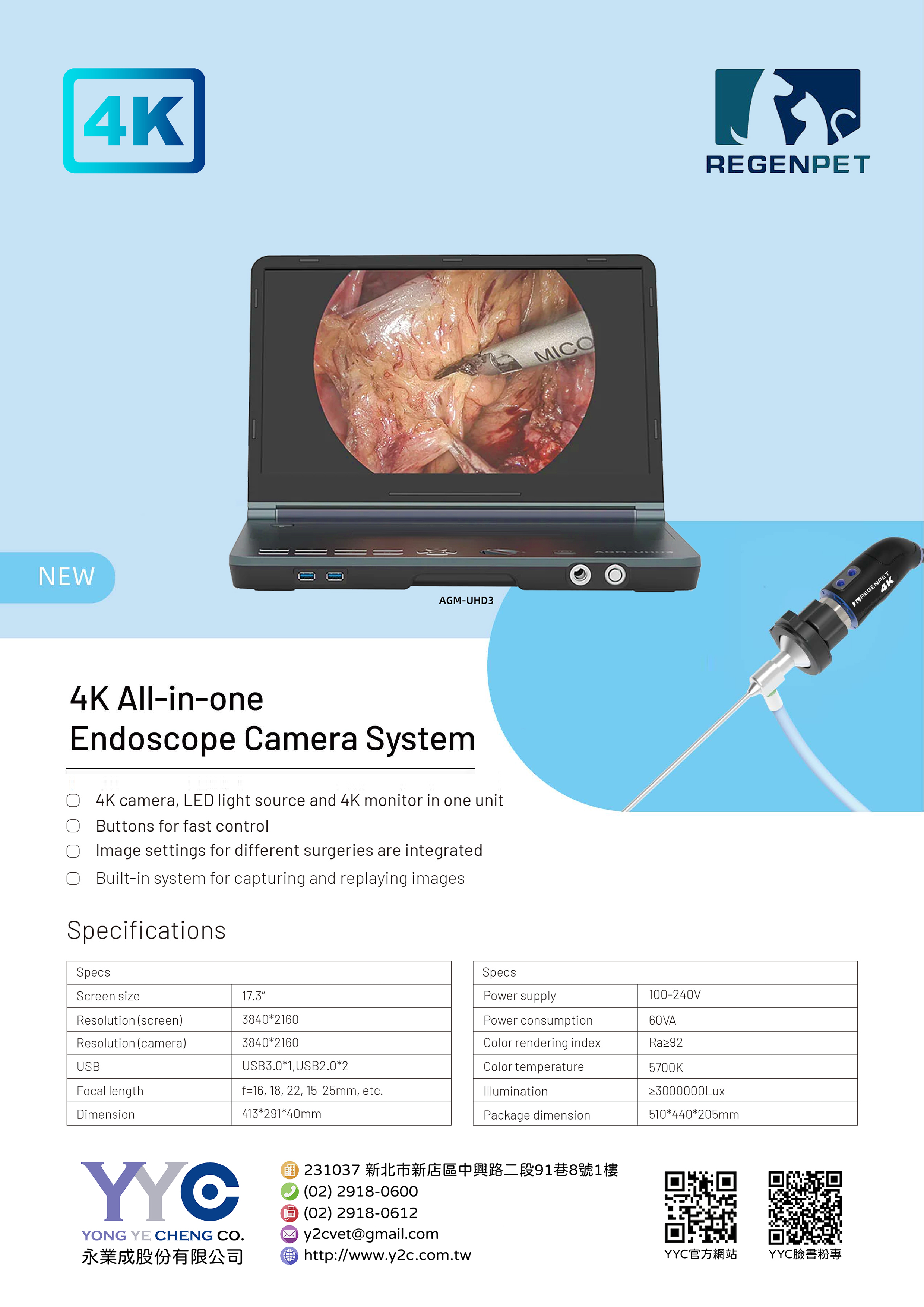 該系統採用超高解析的4K變焦攝影頭及17.3" 4K顯示螢幕,並且支援兩組HDMI輸出埠可同時外接兩台顯示器、10 Bit色深螢幕能顯示10.7億種色彩超低延遲使得圖像顯示細節更細膩更清晰。支援手術影像回放,支援HDMI/VGA,4K信號輸入,預設耳鼻喉鏡、膀胱鏡、關節鏡、腹腔鏡及纖維鏡五種工作模式,支援一鍵切換工作模式。