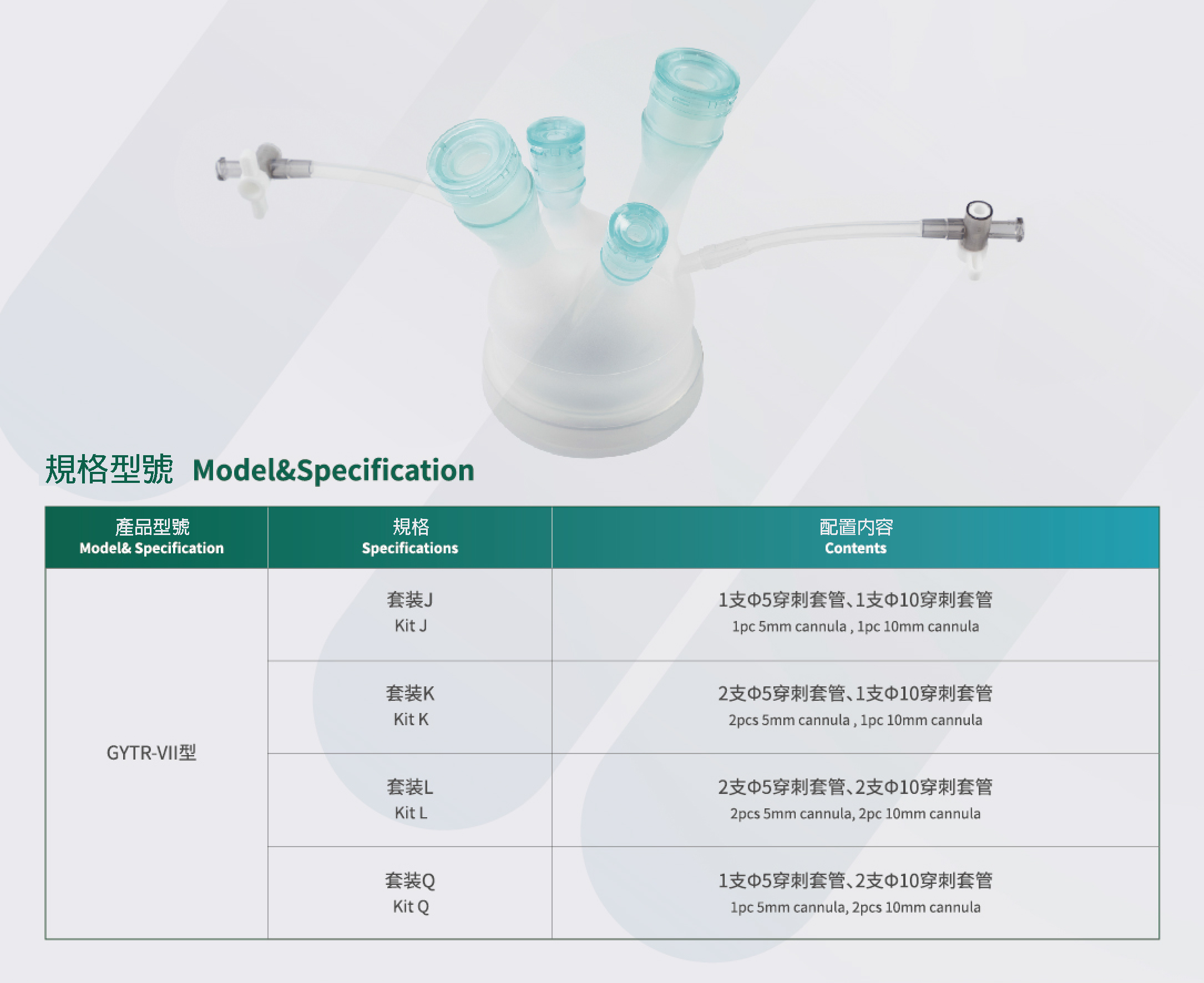 產品特性 1. 材質柔軟,器械操作靈活,操作空間大; 2. 與切口保護套配合使用,安裝拆卸方扁,連接牢固; 3. 每一個通道設計多層密封,密封可靠; 4. 密封採用高強度醫用級矽膠材料,耐器械穿插; 5. 多種規格選擇,適應不同手術需求; 6. 一個手術穿刺孔,多個器械進出通道,患者創傷小; 術後恢復快,無疤痕手術的優選。 規格型號
