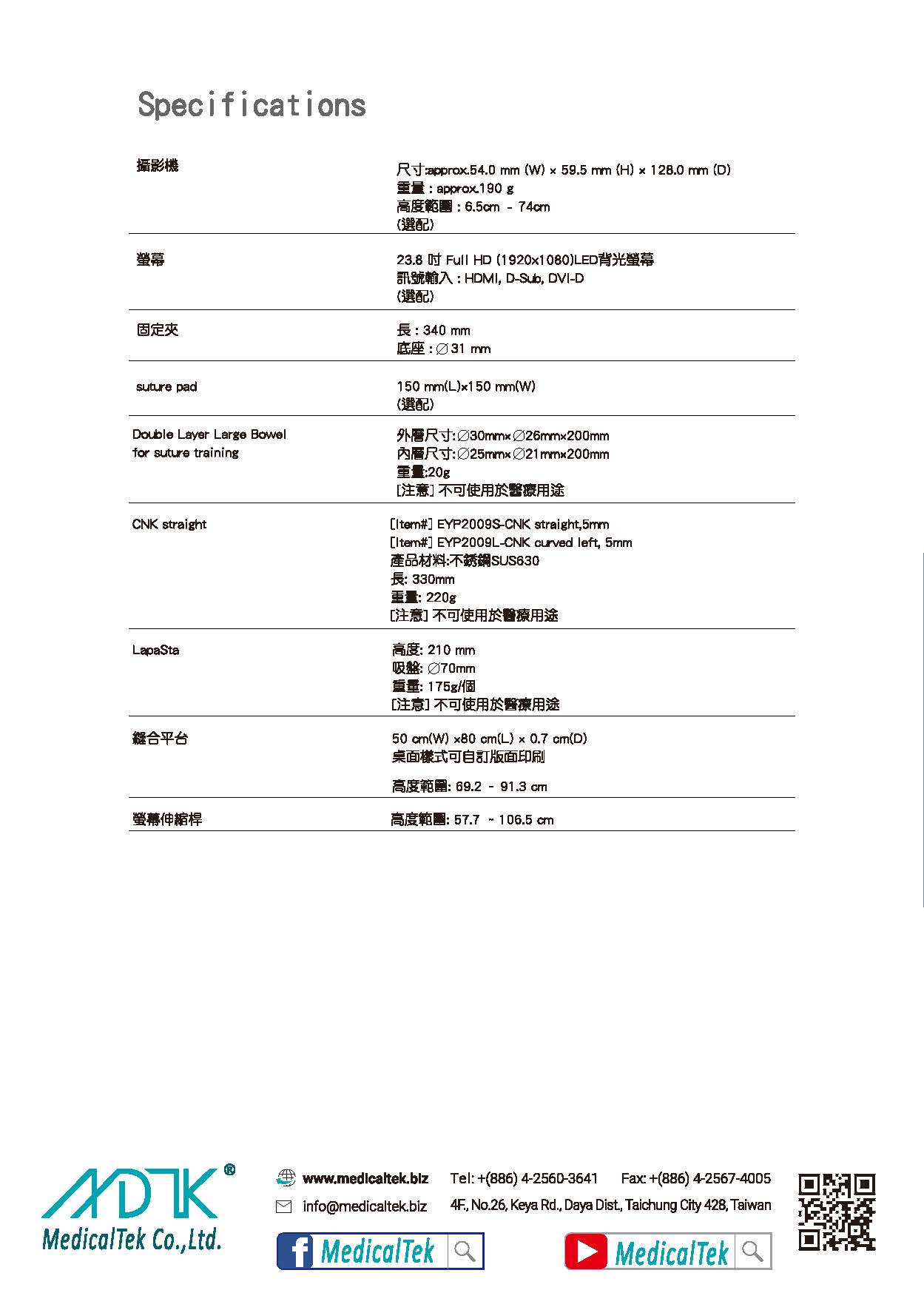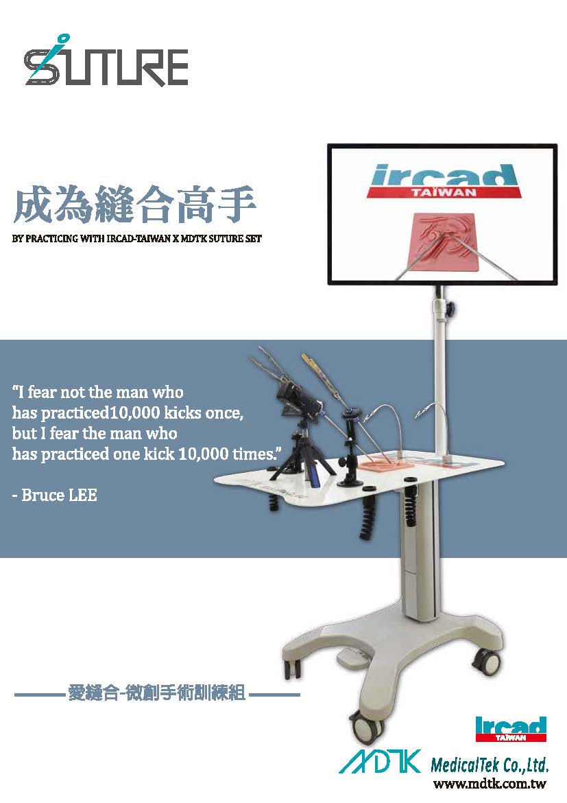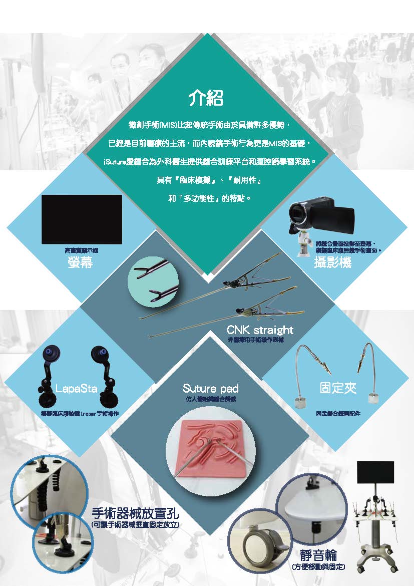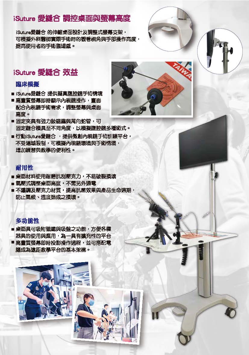iSuture愛縫合-微創手術訓練組 產品介紹 微創受術(MIS)比起傳統手術由於具備許多優勢,已經是目前醫療主流,而內視鏡手術行為更是MIS的基礎,iSuture愛縫合為外科醫師提供縫合訓練平台和腹腔鏡學習系統。 產品效益 產品規格