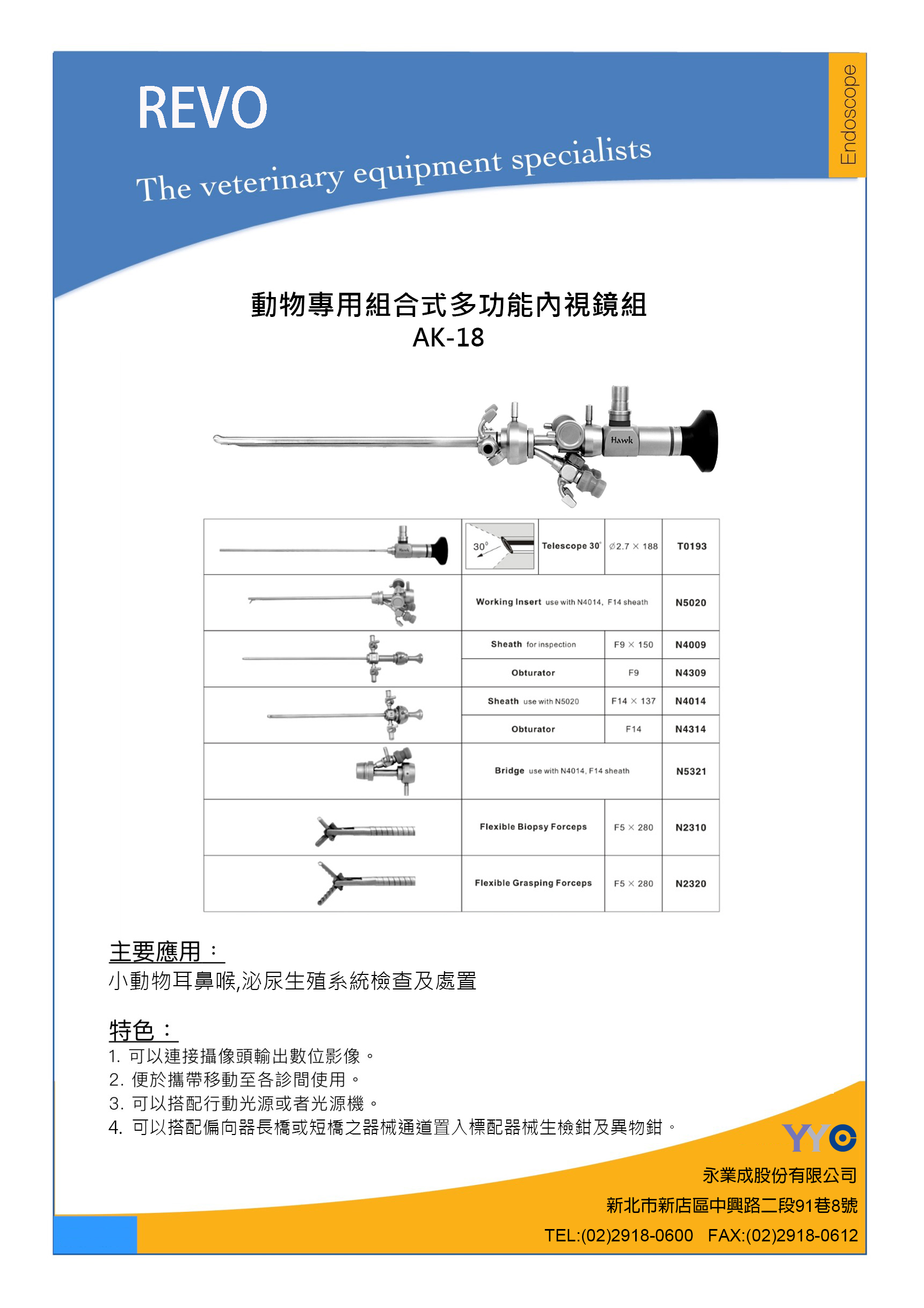 2.7mm 組合式多功能內視鏡組 主要應用: 小動物耳鼻喉,泌尿生殖系統檢查及處置。 特色: 1. 可以連接攝像頭輸出數位影像。 2. 便於攜帶移動至各診間使用。 3. 可以搭配行動光源或者光源機。 4. 可以搭配偏向器長橋或短橋之器械通道置入標配器械生檢鉗及異物鉗。